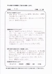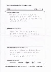 すぐにはいい効果が現れませんが、こんなに最悪の症状と高齢の母でもここまで良くなったのは、先生の施術ですが、全く痛みもない施術なのになぜこのように良くなったのかまだ不思議です。